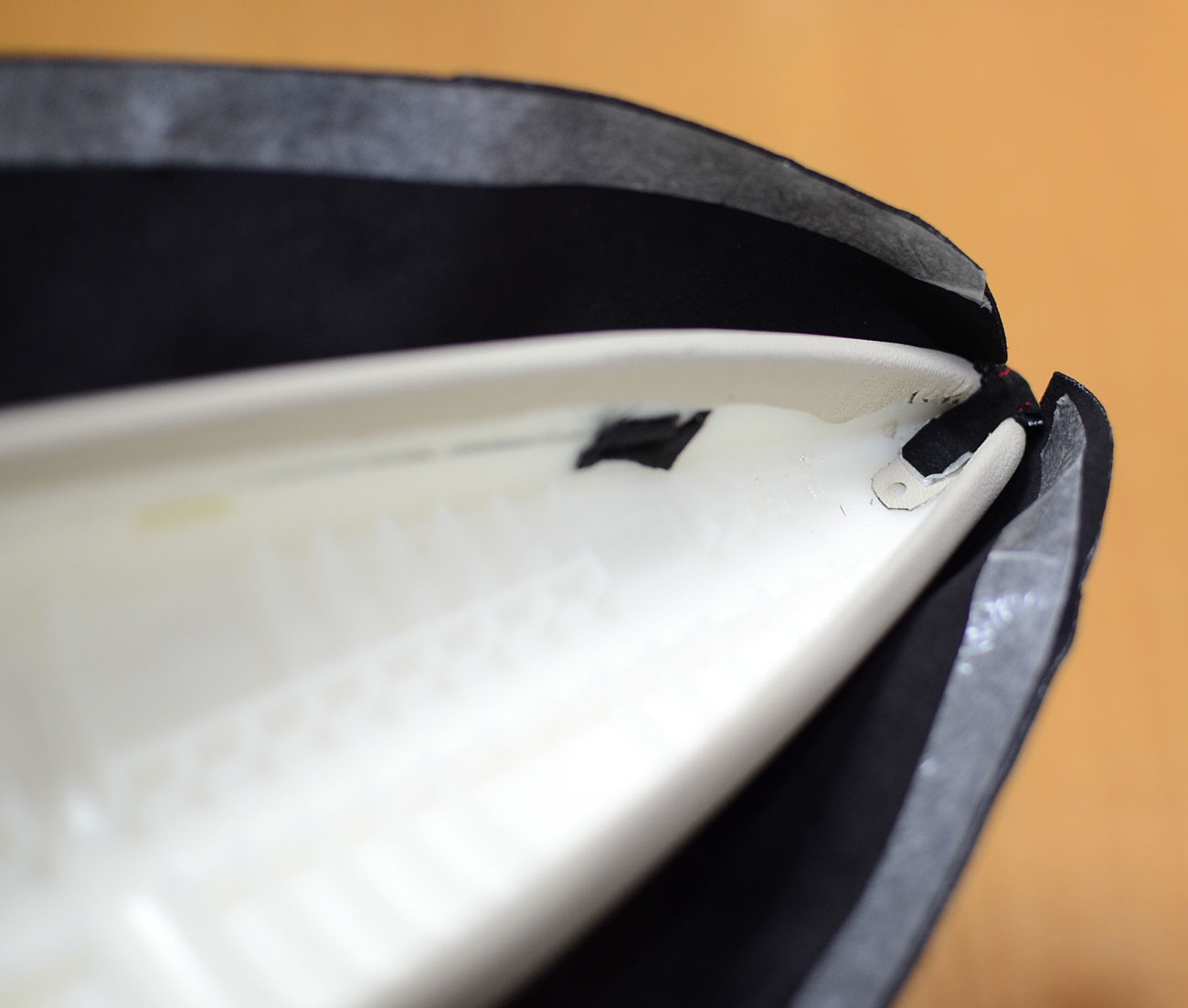アームレストの端の尖った部分には、折り返す形状のベロがあるので、その部分にも両面テープを貼ります。