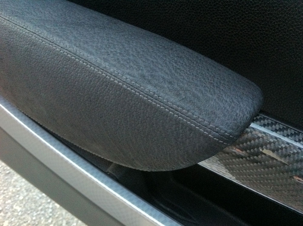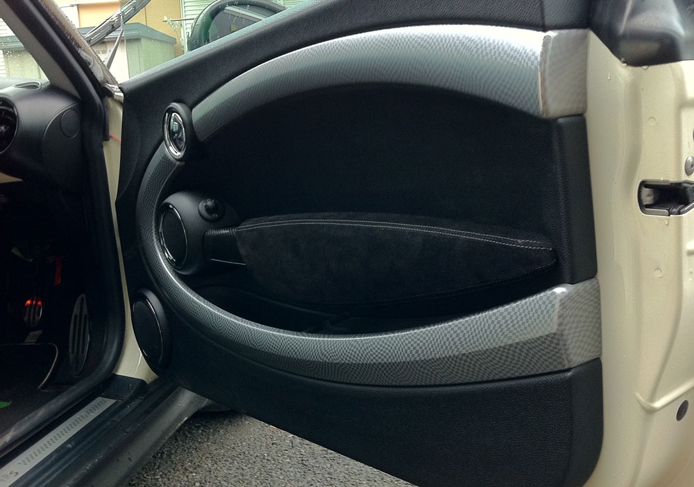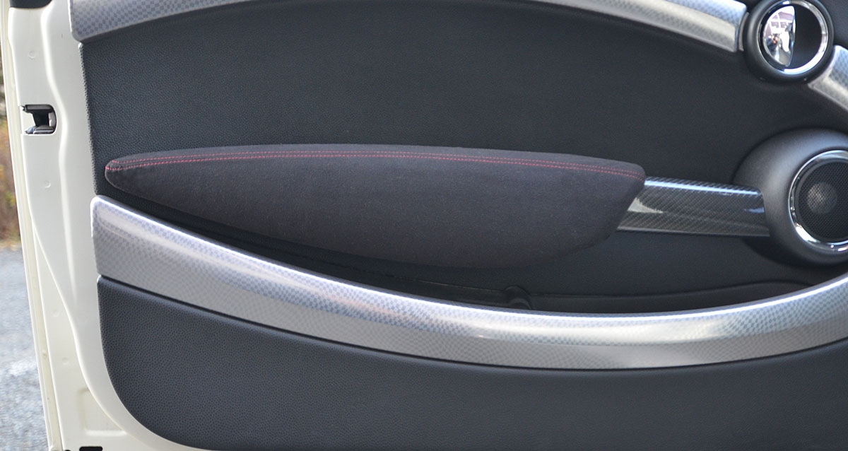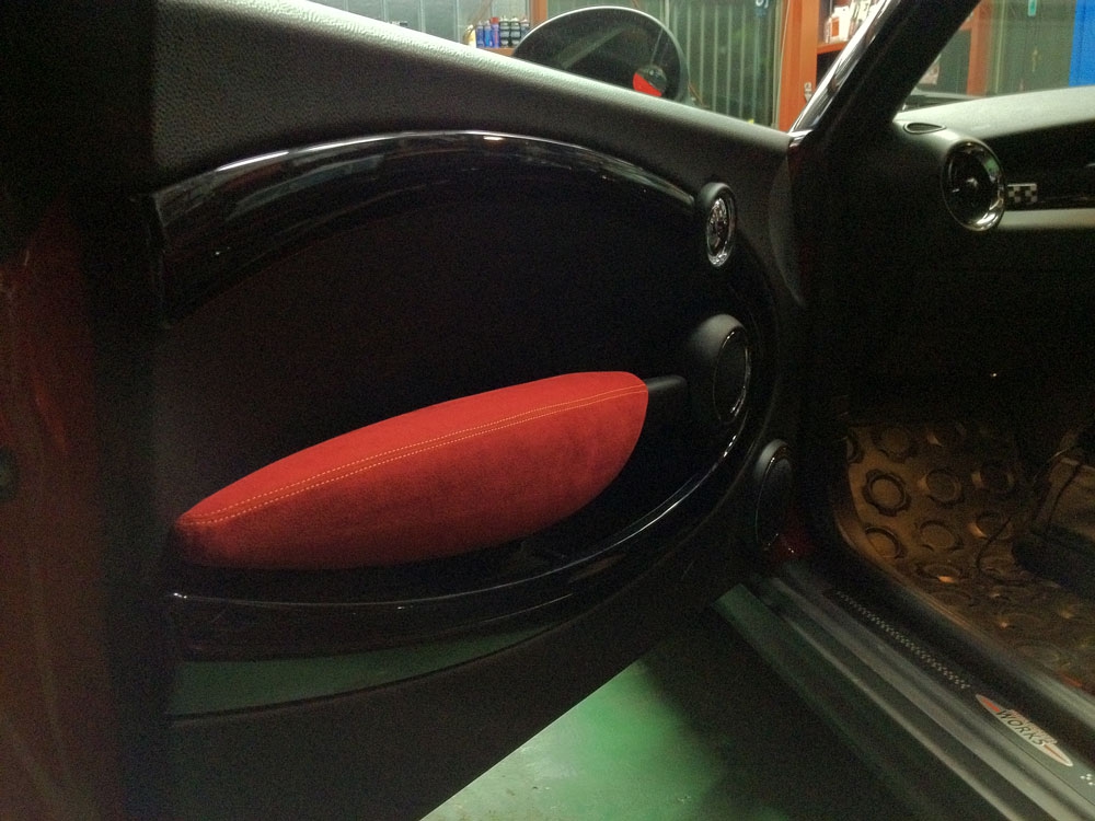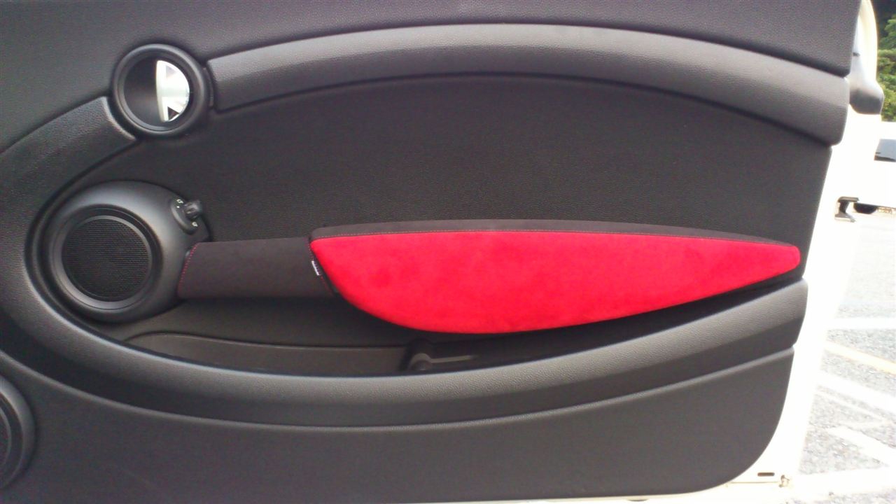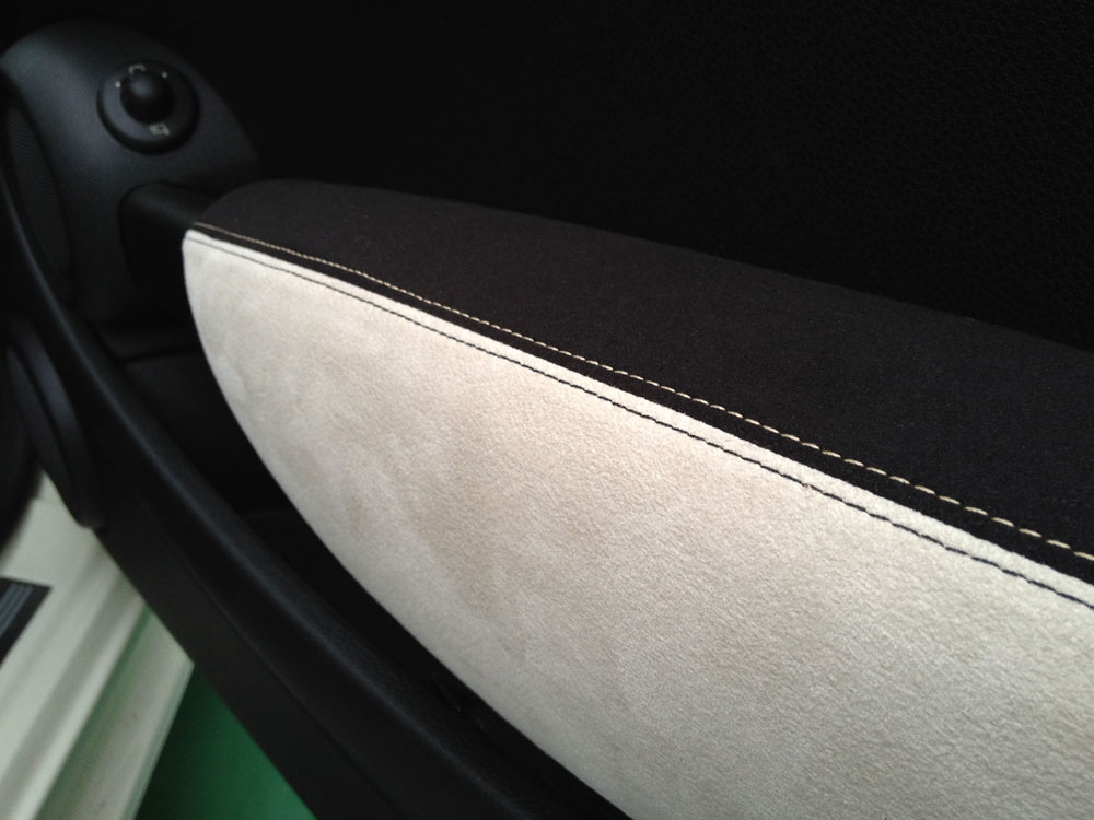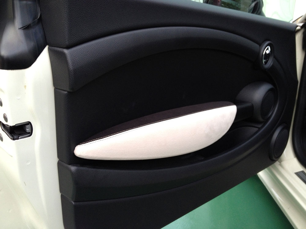 BMW MINI(R56系)のアームレストを高級スポーツカーの内装のようなバックスキン風の生地にするカバーキットです。