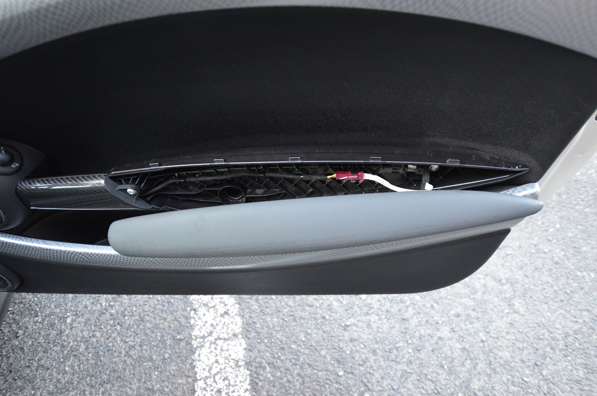 取り付けは取り外しと反対の手順です。アームレストの左右の位置を良く合わせ、下をはめてから上部分を開きながらはめます。アームレストとドアの間にカバーが挟まれるため、カバー自体は両面テープでも問題なく固定されます。