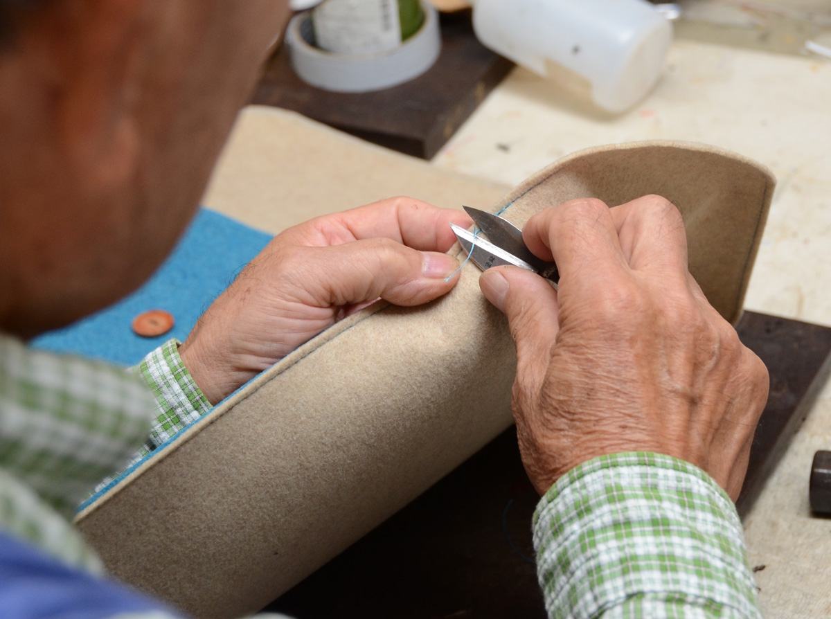 縫った時の伸縮を考えた型紙作りや、合わせにゆがみが出ないようにする製法。ダブルステッチの均一な走らせ方など、日本の職人ならではの繊細な仕事です。