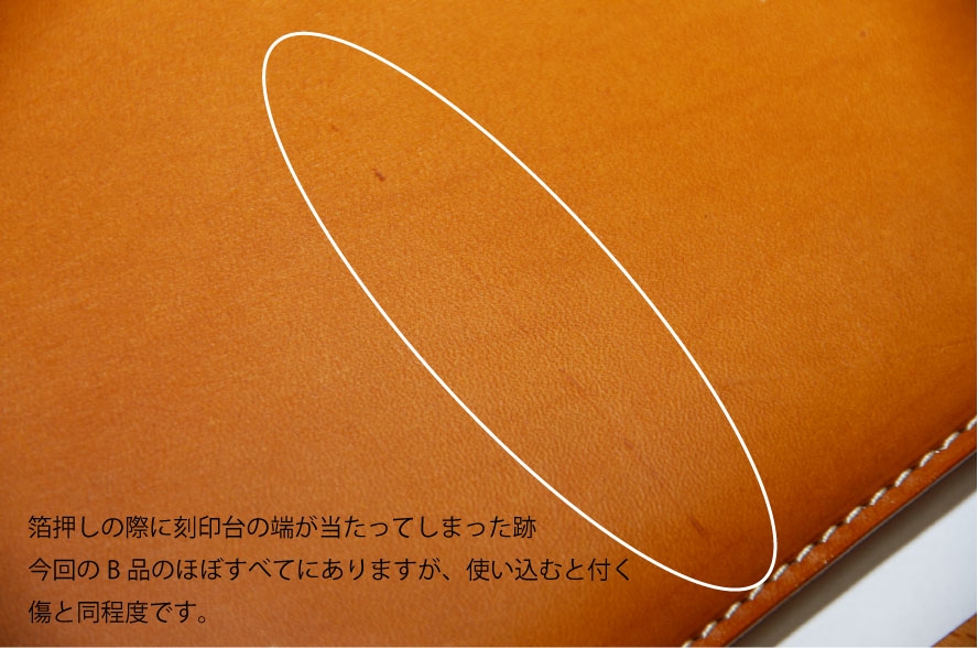 今回のiPadレザーケースアウトレット品は、制作時に付いてしまった箔押し台の端の痕や、小傷などがある品になります。
