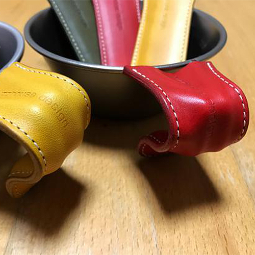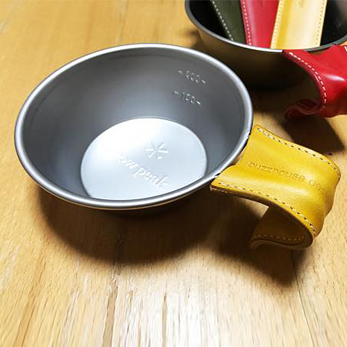 他の人のカップと区別できるように6色のカラーバリエーションを用意しました。植物タンニン鞣しのレザーは、使い込むと色が濃くなって味が出ますので、キャンプの雰囲気にマッチします。取り付けは、きつめなので装着しにくいですが、口の部分を引っ張ったり、お尻の部分を押したりして少しずつ入れて行くと入ります。