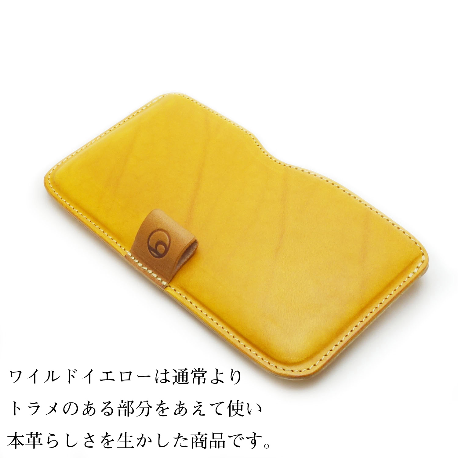ワイルドイエローバージョンは、本革の証である動物のシワや筋やシボなど、模様となっているトラメ部分をあえて積極的に使う事で、1つとして同じパターンが無い世界に1つの個性的なケースです。