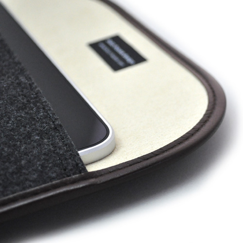 ハンドメイドフェルトケース Delux for iPadは内装に高級車の内装などにも使われるような、しっとりとしたクロス素材(ボンセーヌ)を内側全面貼り高級感と滑るようななめらかさでiPadを収納、取り出すことができます。隙間無くキレイに収めるのは当然ですが、気持ちよく取り出せるのも大切なポイントです。