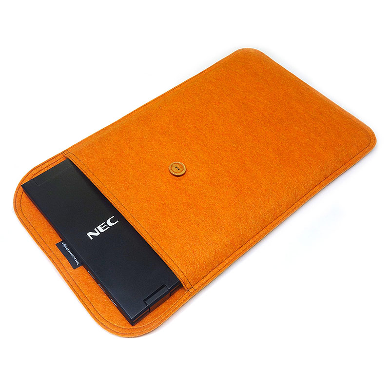 フェルトケースは、過剰な衝撃吸収素材などを使わず、非常にシンプルな作りにする事で、LAVIE Pro Mobile / LAVIE Hybrid ZEROのデザインや携帯性という特徴を損なわない作りになっています。単なる保護するだけのOA用品というケースではなく、人に見せたくなるような ファッショナブルなデザインに仕上げてあります。ケース周囲を手間のかかるダブルステッチで縫製し、コバ(切り口)の幅を持たせる事で、ケースに適度なクッション性とファッション性を両立しています。ハンドメイドフェルトケース for LAVIE Pro Mobile / LAVIE Hybrid ZEROは、オレンジとブラックの2色から選べます。